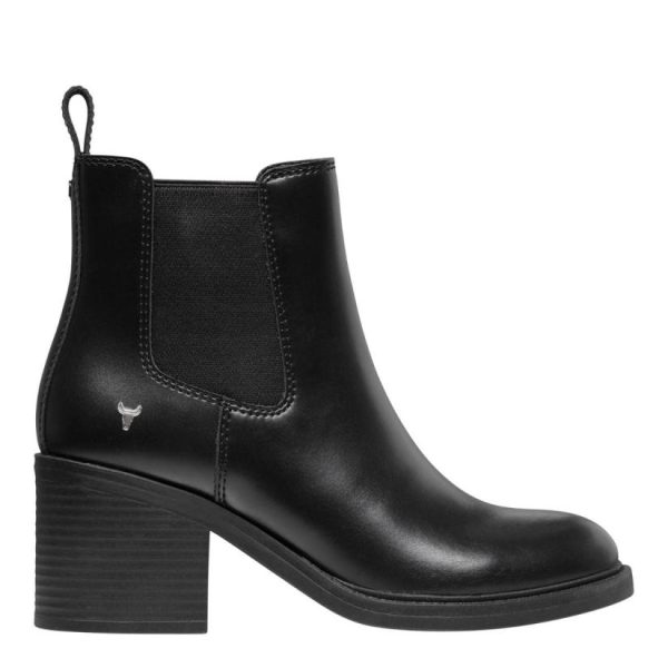 Varsity’, women’s black leather Chelsea boots featuring a classic almond toe shape and standing on 70 mm mid block heels. With double-sided woven elastic gusset and leather pull tabs. Crafted with a durable leather upper and non-leather lining.
