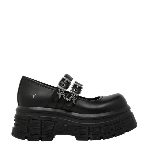 These black platform shoes boast a Mary-Janes style design with twin strap eyelet detailing on the upper and chunky cleated sole.